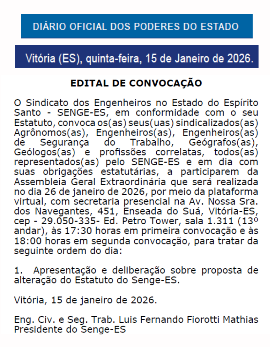 O Edital de Convocação da Assembleia foi publicado no Diário Oficial do Espírito Santo no dia 15/1/26, conforme imagem abaixo: