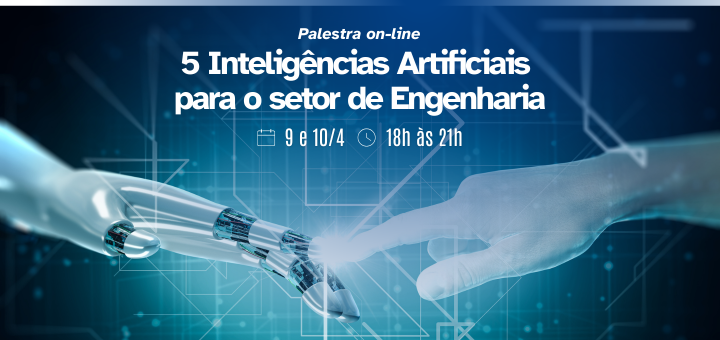 Participe da palestra online “5 Inteligências Artificiais para o setor de Engenharia” nos dias 9 e 10/4, de18h às 21h. Com carga horária de 8h, o evento é uma realização do Sindicato dos Engenheiros no Estado do Espírito Santo (Senge-ES).